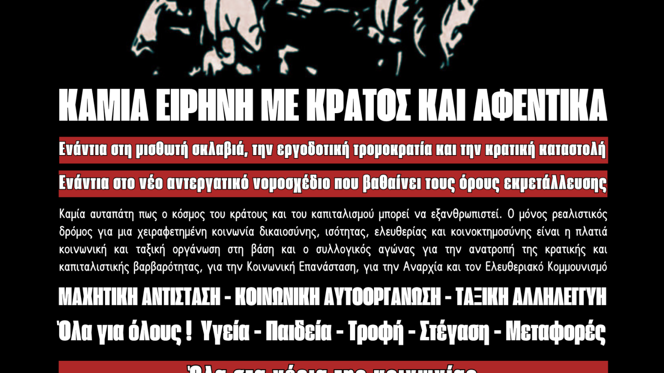 General Strike against the new anti-labor law, wage slavery, employer terror, and state repression Original link in English: https://apo.squathost.com/statement-call-of-anarchist-political-organization-federation-of-collectives-on-the-general-strike-and-demonstration-of-14th-of-october-against-the-new-anti-labor-law/ LAND